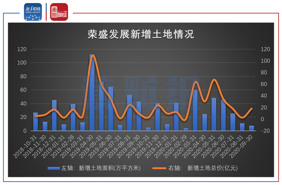 2020年前三季度,荣盛发展累计新增土地面积269.27万平方米,同比下降35.23%;新增土地总价246.44亿元,同比下降5.61%。其中,公司第三季度新增土地面积44.32万平方米,同比下降57.56%,环比下降62.92%;新增土地总价38.27亿元,同比上升10.03%,环比下降71.04%。