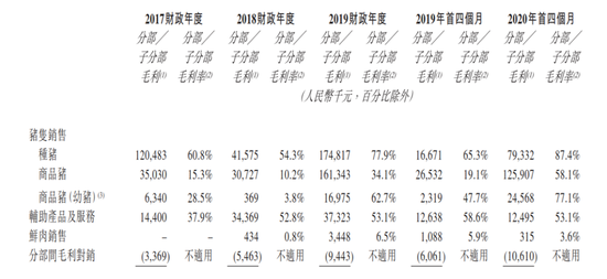 天兆猪业旗下有猪只销售(包括种猪、商品猪、商品仔猪)、辅助产品及服务(如复合预混合饲料及猪只养殖服务)、鲜肉销售三个业务分部。其中,2020年首四个月公司的营收中,猪只销售贡献率超过90%。