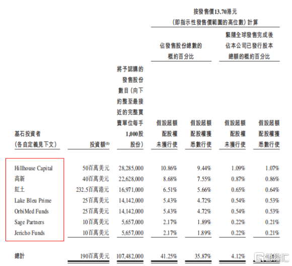 根据公司在招股书中披露显示,按照发行价13.7港元来计算,高瓴资本(Hillhouse Capital)作为基石投资者参与投资5000万美元,按照超额配股权悉数行使计算,共计持股1.07%。此外,多家著名PE/VC机构纷纷参与,其中包括:高新、红土、清池资本(Lake Bleu Prime)、奥博资本(Orbi Med Funds)、锐智资本(Sage Partners)、Jericho Funds 等机构作为基石投资者参与。