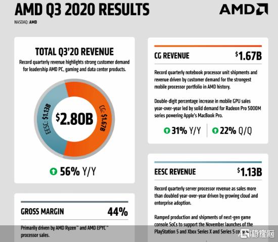 同一天,AMD还发布了今年三季度财报,数据显示,其三季度营业额为28亿美元,同比增长56%,主要得益于企业、嵌入式和半定制事业部及计算与图形事业部的营业额增长。经营收入为4.49亿美元,净收入3.9亿美元,摊薄后每股收益0.32美元。