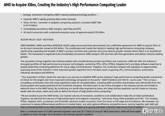 AMD没让市场失望,收购的消息仅仅传了半个多月,AMD就一纸声明让其成真了。当地时间10月27日,AMD宣布,公司与FPGA(“现场可编程门阵列”)芯片龙头赛灵思已达成一项最终协议,同意AMD以发行总价值350亿美元股票的方式收购赛灵思。