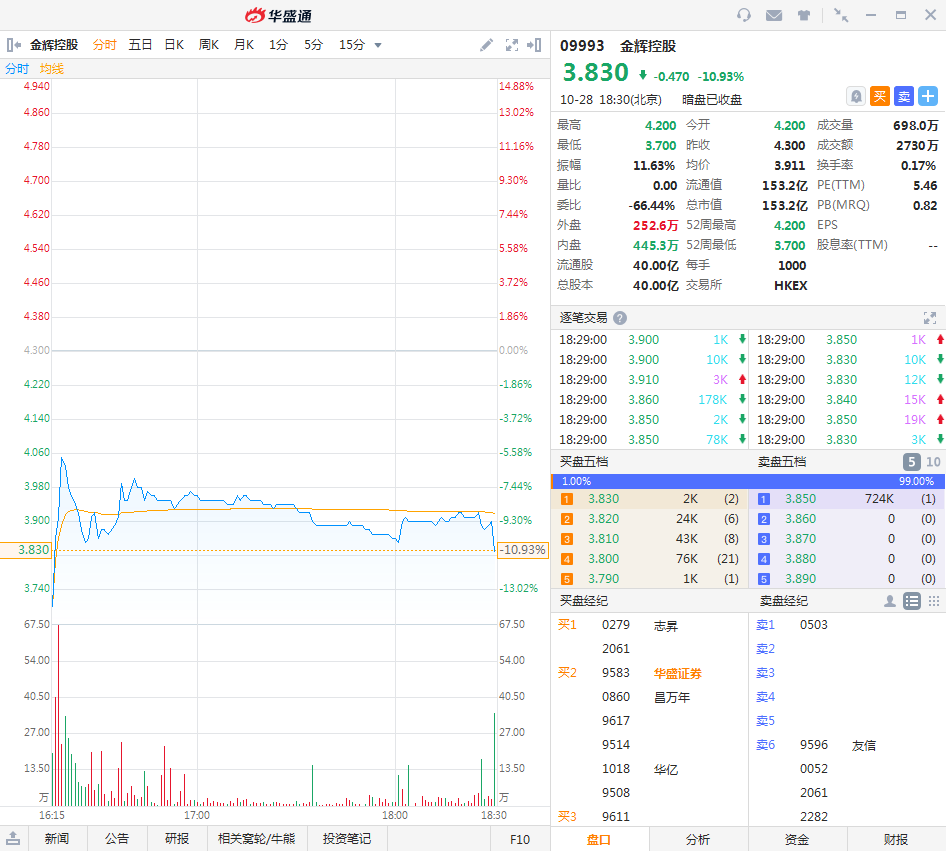 华盛资讯10月28日讯,金辉控股(09993.HK) 暗盘收盘报价3.83港元,较发行价4.3港元跌幅为10.93%,一手账面亏损470港元。最新成交额2730万港元,总市值为153.2亿港元,该股将于10月29日正式上市。