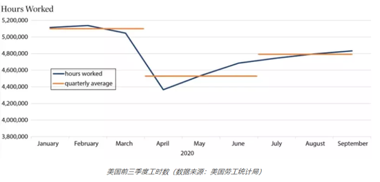 不过,继4月份工时数大幅萎缩后,5、6月份工时数出现大幅反弹,而正是5、6月份的反弹才推动了第三季度工时数幅增长。事实上,在第三季度增加的工时数当中,有超过一半来自5、6月份。换句话说,即使第三季度工时数保持在6月份水平不变,第三季度工时数增幅仍能达到15%。