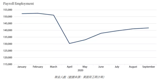 考虑到就业市场留下的巨大窟窿,增长放缓不是个好的兆头。与2月份相比,目前全美就业人数减少超过1000万人。在6月份新增就业岗位达到创纪录的480万后,就业增速开始放缓,7月份新增就业岗位降至180万,8月份为150万,9月份更是降到了只有66万。如果就业增速持续放缓,就业市场要恢复到疫情前水平可能需要数年。从就业市场的角度来看,本轮经济复苏的形态显然不是“V”型。