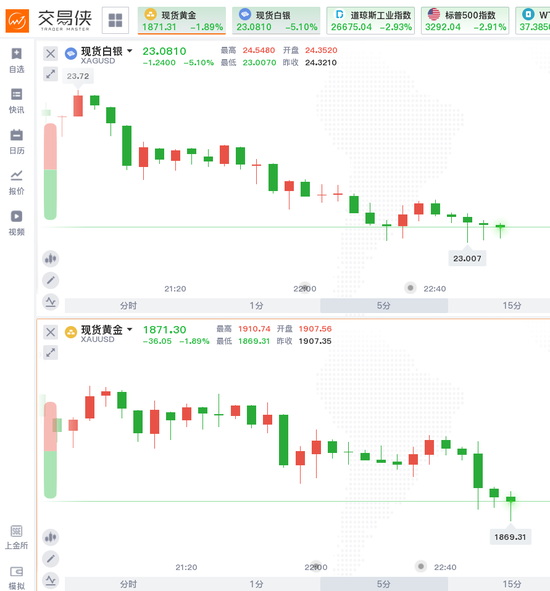 北京时间10月28日美盘时段,现货黄金跌破1870美元/盎司,较日高跌超40美元,现跌1.96%。现货白银重挫5%,逼近23美元/盎司,创三周新低。