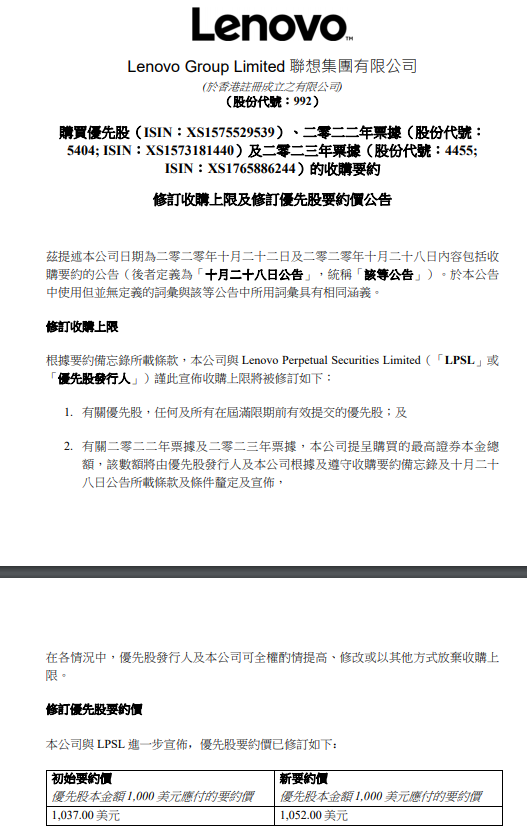 联想集团:将优先股收购要约价格从1037提高至1052美元