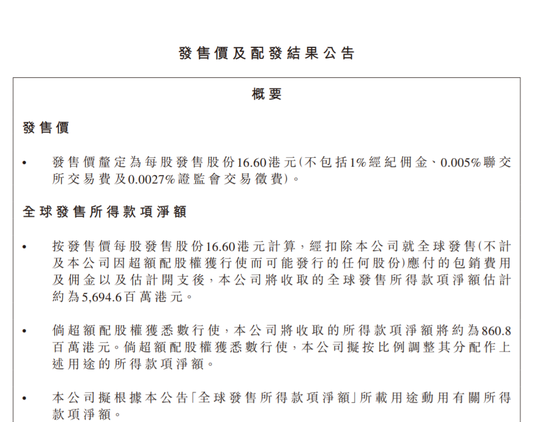 10月29日消息,世茂服务(00873.HK)发布全球发售结果公告,发售价厘定为每股发售股份16.60港元,本公司将收取的全球发售所得款项净额估计约为56.946亿港元(假设超额配股权不获行使)。香港公开发售超额认购约12.86倍,获4.6万人申请,香港公开发售5882.4万股。国际发售占公司发行新股的90%,超购近10倍。公司一手中签率50%,世茂集团持股66.5%。