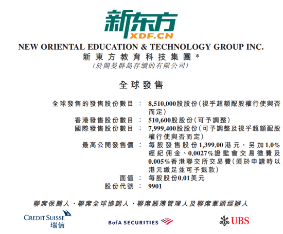10月28日,新东方宣布启动全球发售。本次发行将新发行8510000股普通股新股,公司普通股将在香港联合交易所有限公司(简称“联交所”)主板上市,股份代号为9901。本次香港公开发售将于2020年10月29日(星期四)上午九时开始,于香港时间2020年11月3日(星期二)中午十二时结束。瑞士信贷(香港)有限公司、BofA Securities及UBS担任本次发行的联席保荐人及联席全球协调人。公司最高发行价为1399港元,一手10股,入场费为14131港元。