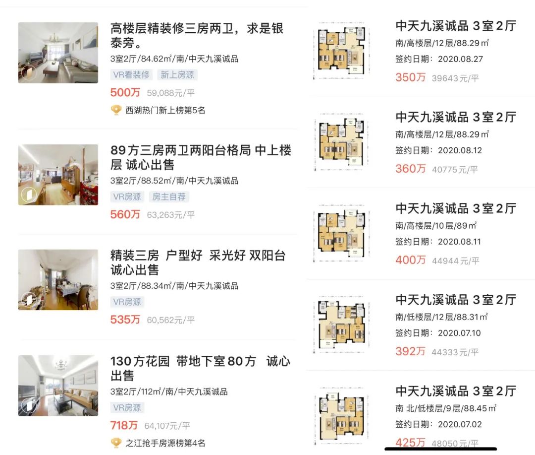 在贝壳上面的成交价显示,中天九溪诚品8月份的成交价才4万出头,但是如今挂牌价齐刷刷的5万/平以上,一些不急卖的业主已经挂到6万/平以上。