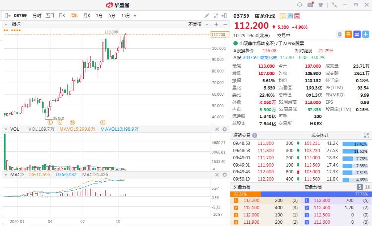 截至发稿,康龙化成涨4.96%,报112.2港元,成交额2611万港元。