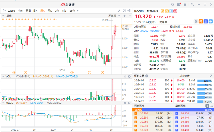 金风科技AH股逆势上涨,A股涨6%,H股大涨7%,报10.32港元。