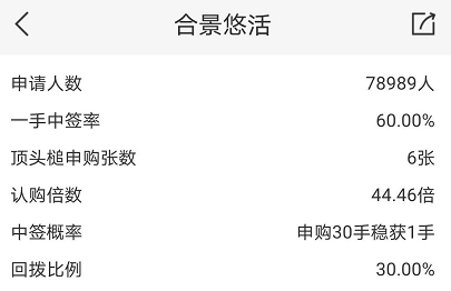 合景悠活一手党4.5万人,中签率60%,申购30手稳中一手,顶头槌只有6张。