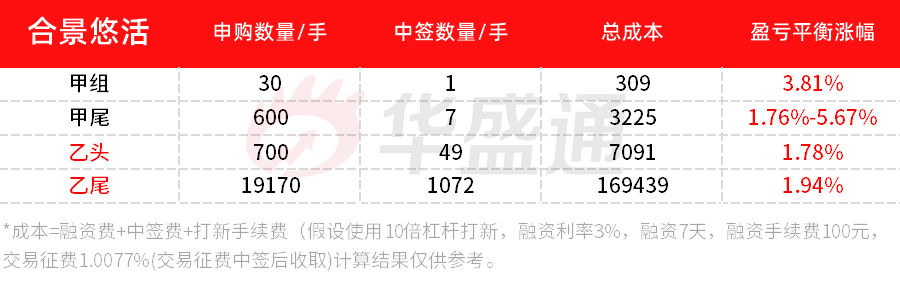 合景悠活甲组盈亏平衡点大概是3.81%。乙头盈亏平衡点1.78%,获配49,000股-50,000股,市值38.6万-39.4万。