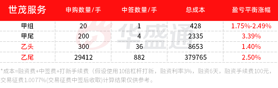 世茂服务甲组盈亏平衡点大概是1.75%-2.49%,表示涨幅超过这个数就能赚钱。乙头盈亏平衡点1.4%,获配 36,000股,市值59.7万。