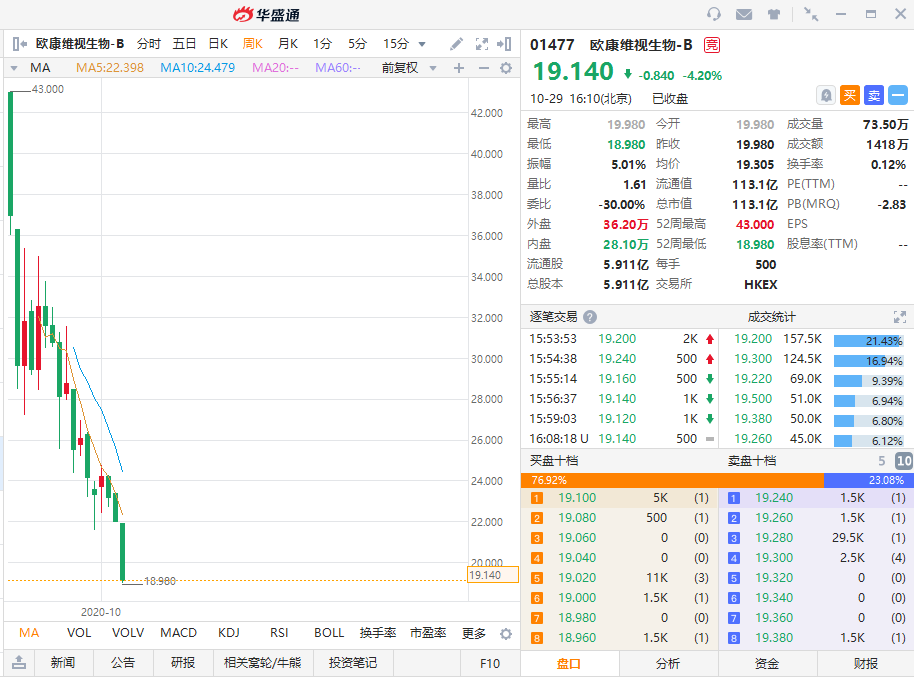 欧康维视生物-B(1477.HK)首日上市高开193.32%,最高从发行价14.66港元涨至43港元,但随后股价一路回调。