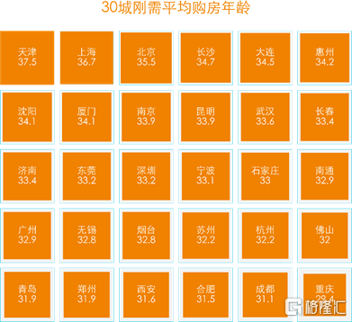以购房年龄最大的天津为例,刚需购房平均约37.5岁,而天津整体平均购房年龄在35.4岁水平。与之相对的,重庆、成都、合肥、西安、郑州等新一线城市的刚需平均购房年龄相对较低,其中重庆刚需购房年龄最低,约为29.4岁。