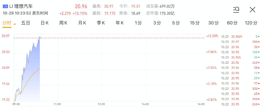 华盛资讯10月29日讯,理想汽车盘中大涨超12%。截止发稿,理想汽车涨12.15%,报20.96美元,当前总市值175.3亿美元,成交量接近500万。