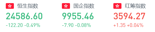 周四,恒生指数开盘跌1.69%,全天低开高走。截至收盘,恒生指数跌122.2点或0.49%,报24586.6点,全日成交额达1331.86亿。国企指数跌0.08%,报9955.46点,红筹指数涨0.04%,报3594.27点。