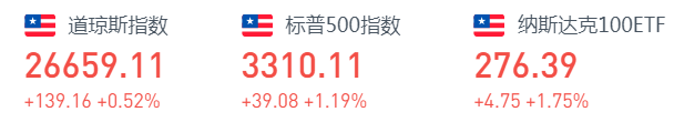 截至收盘,道琼斯指数涨139.16点,涨幅0.52%,报26659.11点;标普500指数涨38.27点,涨幅1.17%,报3309.30点;纳斯达克综合指数涨180.72点,涨幅1.64%,报11185.59点。