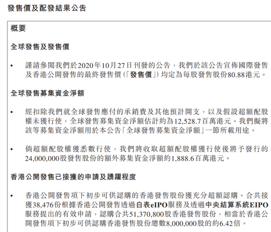 10月30日消息,万国数据发布发售公告,公司每股定价80.88港元,公开发售获3.85万人认购,超购5.42倍,国际配售超购7.4倍,发售占比95%。公司每手100股,股票代码9698,一手中签率80%,11月2日正式上市。