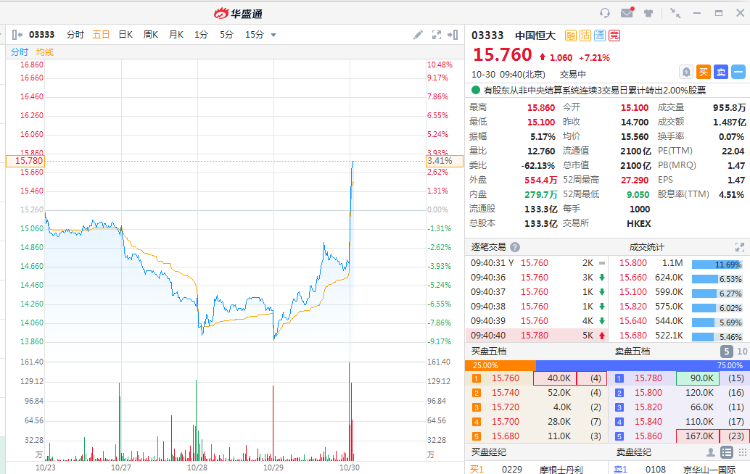 10月30日消息,中国恒大港股逆市大涨7%,报15.76港元,最新市值2100亿港元。中国恒大在港交所公告,今日回购90万股,耗资1326万港元。