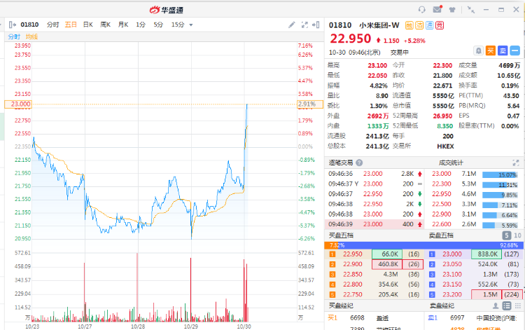 10月30日消息,小米集团涨5.28%,现报22.95港元,最新市值5550亿港元。