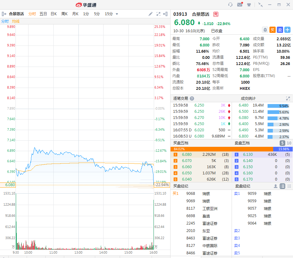 华盛资讯10月30日讯,合景悠活(03913.HK)收跌22.94%,报价6.08港元,全日最高价7.0港元,最新总市值122.6亿,一手亏损1810港元。世茂服务(00873.HK)首日平收,开盘价15.8港元,全日最低价15.0港元,最新总市值390.5亿,成交额19.13亿。