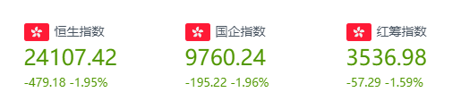 恒生指数上周五开盘跌0.21%,午后受外围股指暴跌影响,恒指一度跌超500点。截至收盘,恒生指数跌479.18点或1.95%,报24107.42点,全日成交额达1517.27亿。国企指数跌1.96%,报9760.24点,红筹指数跌1.59%,报3536.98点。