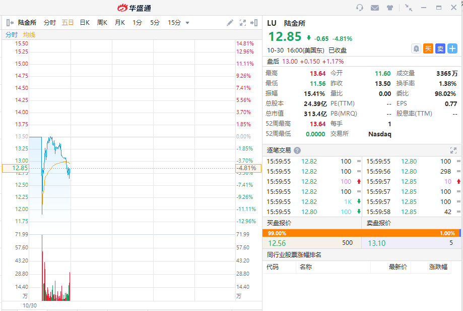 北京时间30日晚,陆金所正式挂牌纽交所。其美股发行价确定为13.5美元/ADS,拟发行1.75亿股ADS。成为金融科技三巨头(蚂蚁集团、京东数科)中首个登陆资本市场的独角兽。但受市场情绪拖累,陆金所交易首日收报12.80美元,跌5.19%,市值312亿美元。
