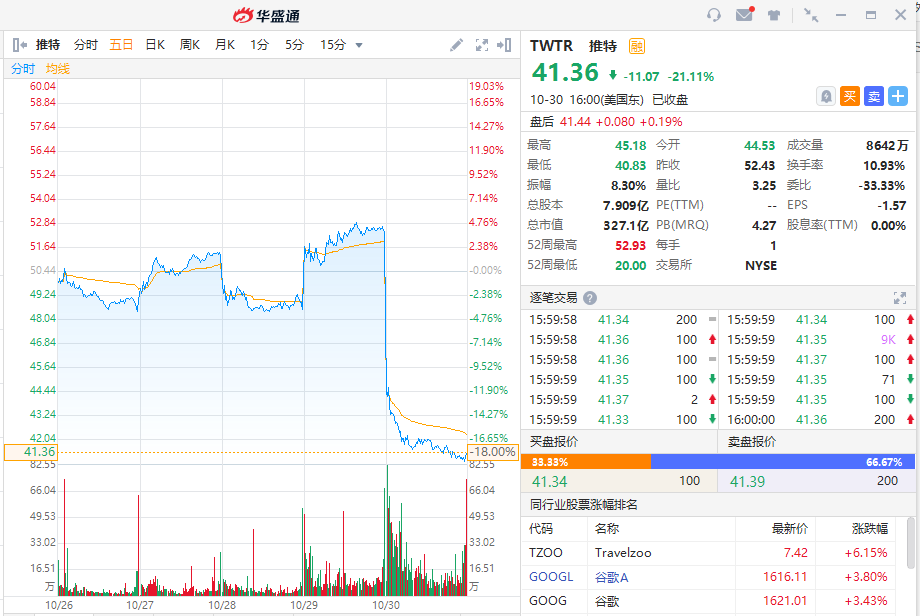 美国总统特朗普以推特治国著称,今年曾创出一日推送几十次的历史纪录。但总统加持,也救不了这家互联网巨头的颓势。周五,推特暴跌超21%。截至收盘,报41.35美元,跌21.13%,市值蒸发近90亿美元,折合人民币600亿。主要源于Twitter不及预期的第三季度财报。