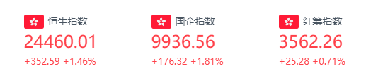 恒生指数周一开盘涨0.69%,全天震荡上扬。截至收盘,恒生指数涨352.59点或1.46%,报24460.01点,全日成交额达1161.93亿。国企指数涨1.81%,报9936.56点,红筹指数涨0.71%,报3562.26点。