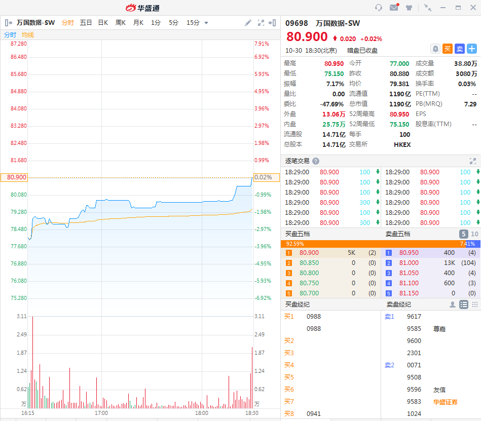 华盛资讯10月30日讯,万国数据-SW(09698.HK) 暗盘收盘报价80.9港元,微涨0.02%,一手账面盈利2.0港元。最新成交额3080万港元,总市值为1190亿港元,该股将于11月2日正式上市。