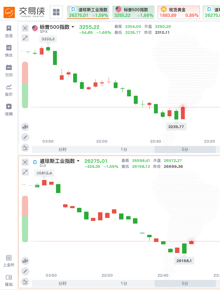 北京时间周五美盘时段,美股三大股指齐齐低开后持续走低,多家重磅科技股财报表现不佳,纳指盘中一度跌2.74%,道指跌幅一度扩大至500点。