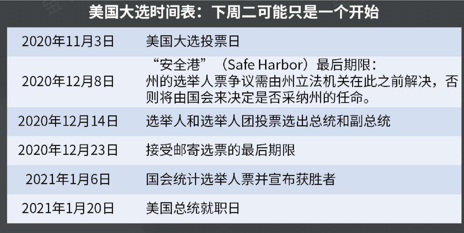 首先,下周二,将迎来万众瞩目的2020年美国大选投票日,因为首次采用邮寄选票的方式,美国51个州中有25个州允许选票晚于大选日寄到,因此市场预计投票日当天恐不能揭晓最终结果,且结果最晚可能拖到明年才能确认: