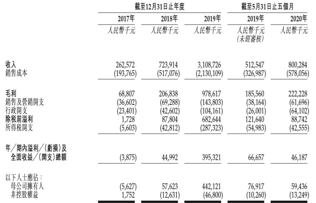 毛利方面,2017年-2019年及截至2020年前5月分别为6880万元、2.07亿元、9.79亿元及2.22亿元,毛利率分别为26.2%、28.6%、31.5%及27.8%。