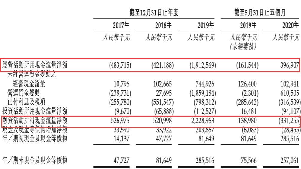 另外融资活动所得现金流也波动较大。2017-2019年,这一数据还为正值。到了截至2020年5月31日,这一数据降至-3.31亿元,去年同期还是1.39亿元。这是缺钱的节奏?