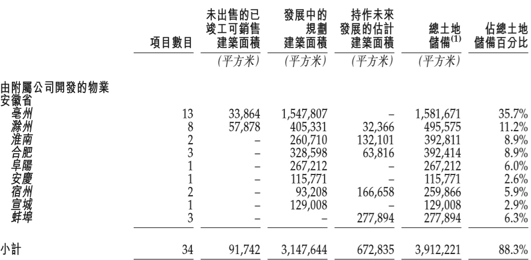 截至2020年7月31日,我们拥有42个处于不同开发阶段的物业项目,总土地储备面积约4.4百万平方米,其中约4.0百万平方米或90.3%位于安徽省。5个位于江苏省及1个位于山东省。