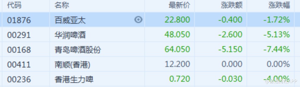 截至10月30日港股收盘,港股啤酒板块个股不同程度下跌,其中百威亚太业绩发布后跌超4%,青岛啤酒发布业绩后今日跌7.44%,A股青岛啤酒盘中更是跌停。