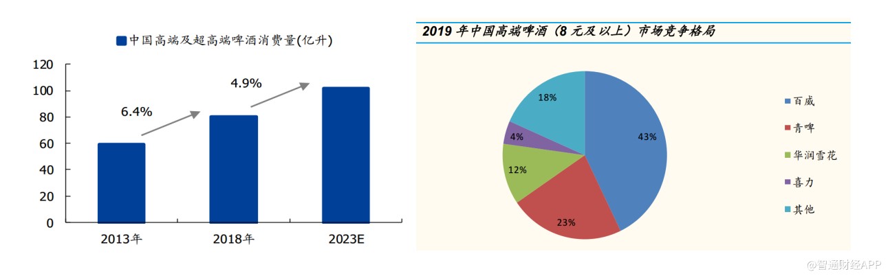 从数据上来看,2013年至2018年我国高端机超高端啤酒年消费量从60亿升增至约80亿升,年复合增长6.4%,预计2023年将达到100亿升。而在市场格局方面,2018 年百威在中国地区高端产品销量占比达 47.16%,遥遥领先于其他玩家。