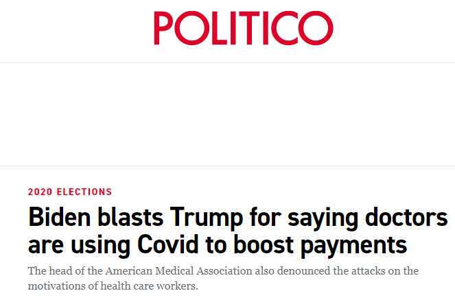 “我们的医生都是聪明人。所以他们会说,‘很抱歉,但是你们知道,每个人都是死于新冠’,”特朗普说,“但是在德国和其他地方,如果你心脏病发作,或者你得了癌症,你(就是)得了绝症。(如果)你染上新冠,他们会说你死于癌症、死于心脏病发作。在我们这里,当你(对死因)有疑问的时候,就选择新冠。”