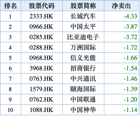 本周,南下资金净卖出长城汽车4.33亿港元,净卖出中国太平3.87亿港元。此外还减持了比亚迪电子、万洲国际、信义光能等标的。