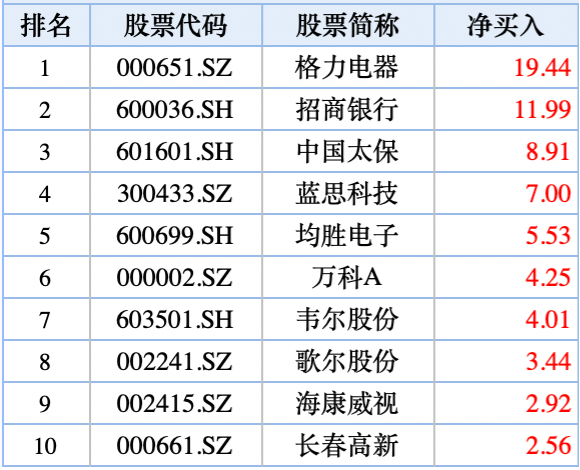 本周,北上资金净买入最多的个股是格力电器,一周净买入19.44亿元。此外,北上资金净买入招商银行近12亿元,净买入中国太保近9亿元,净买入蓝思科技7亿元。
