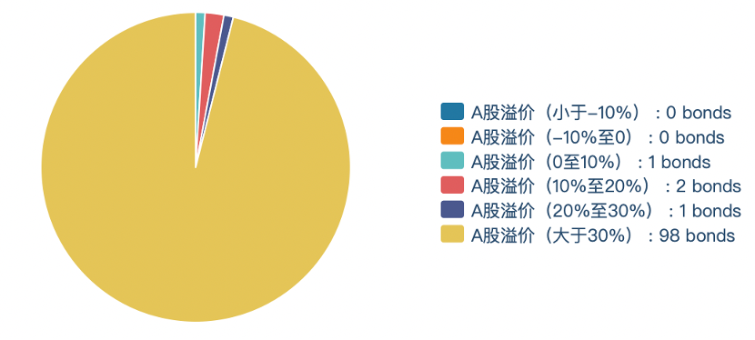 本周共有98只A股溢价超过30%,有3只A股溢价在10%-30%之间,溢价差距仍然高企。