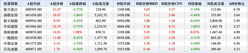 个股方面,复旦张江、国联证券、新天绿能、中信建投、洛阳玻璃等个股仍然位列溢价榜首,投资者可关注相关个股估值回归机会。