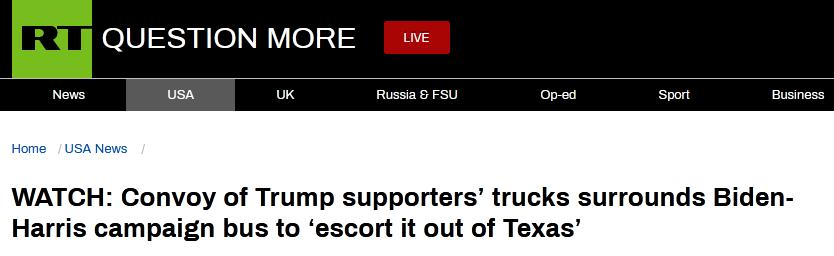 “特朗普支持者的车队‘包围’了拜登-哈里斯的竞选大巴” , RT1日以此为题报道称,10月30日,一辆写有“拜登-哈里斯”大字的白色大巴正行驶在路上,突然,许多辆插着特朗普应援旗帜的皮卡车跟上了这辆大巴,并将其“包围”。