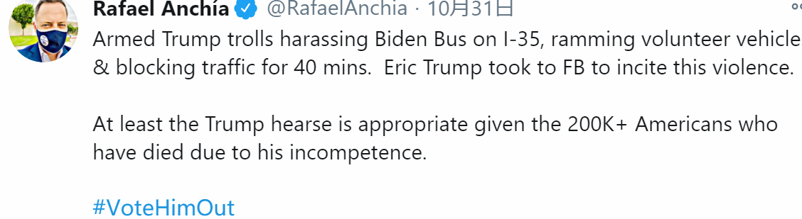关于此次事件,得克萨斯州民主党籍众议员拉斐尔·安奇亚(RafaelAnchía)随后发布推文谴责称,这是特朗普支持者发动的一次“危险的骚扰”。他还说,特朗普的支持者 “撞上了志愿者的车辆,并阻塞交通40分钟”。↓