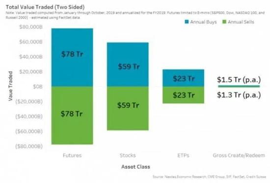 每年的创造和赎回总额约为2.8万亿美元。这听起来似乎很多,但一年下来,这只占美国股票交易的3%,相当于每年约59万亿美元的买卖总额。