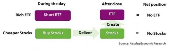 但是,ETF的交易量大并不意味着可以交易基础股票。由于ETF的买卖双方足够多,他们都完全不在“股票套利”区域内交易。交易数据也表明如此。