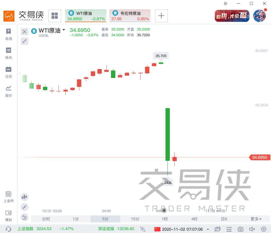 周一07:00,WTI原油期货开跌2.15%,报34.98美元/桶,随后一度扩大至3.4%;布伦特原油期货一度跌2.64%。