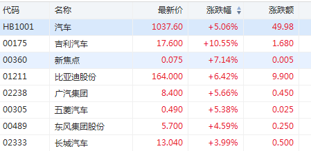 汽车股集体走高,吉利大涨10%,比亚迪涨6%,广汽、东风涨超5%。
